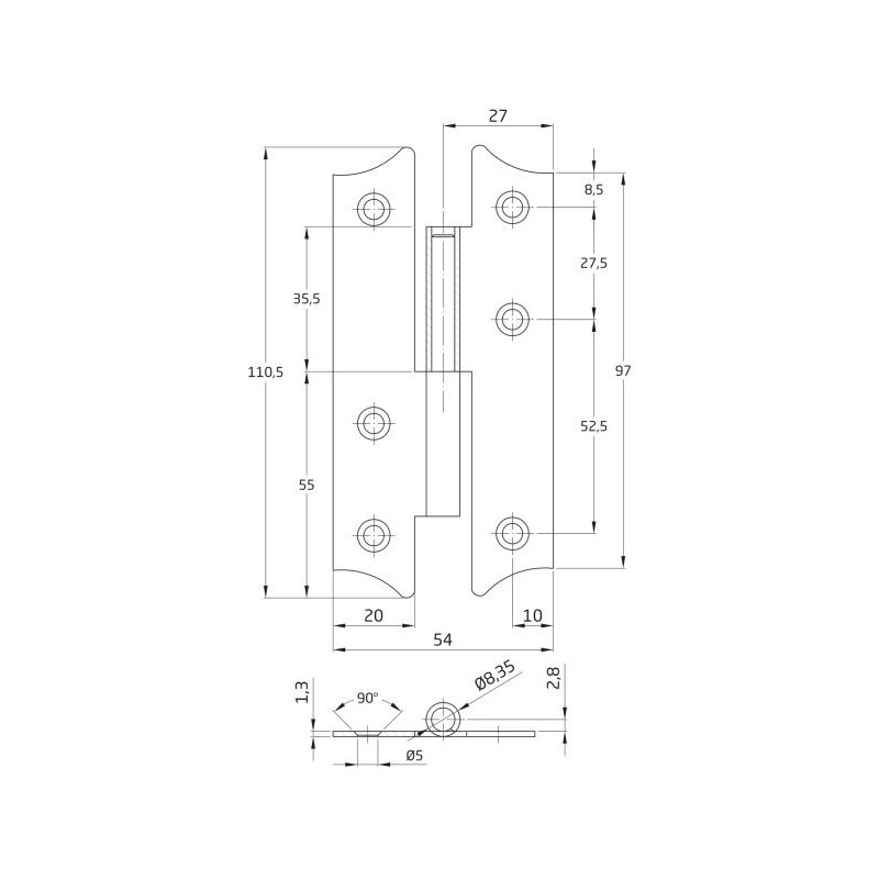 - Pernio de sobreponer en acero, para puerta lisa. Espesor: 1,2 mm.