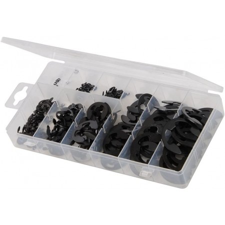Acero con acabado pavonado. Anillos externos para usar en vástagos y anillos internos para usar en el interior de agujeros. Permite la rotación y evita el desplazamiento lateral.Tamaños: diámetros internos de 12 - 20 mm y externos de 6 - 25 mm. Estuche de almacenaje con diferentes compartimentos.