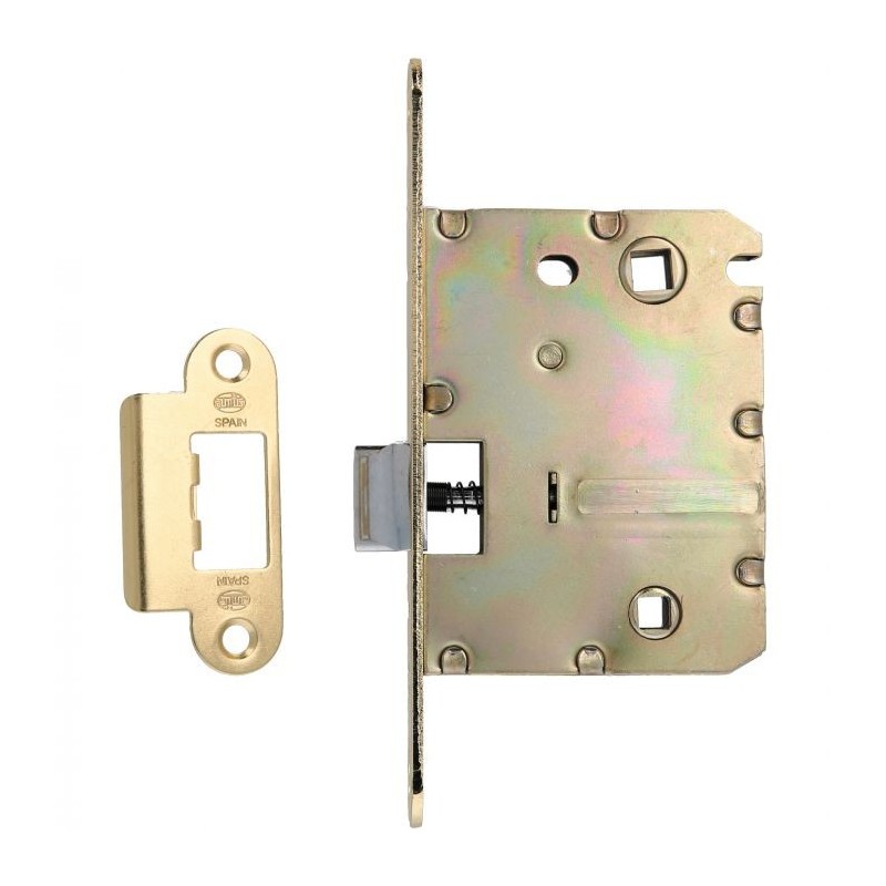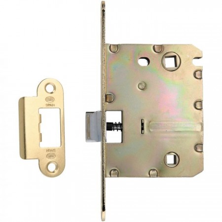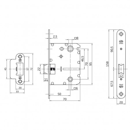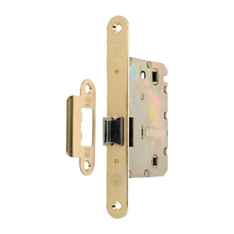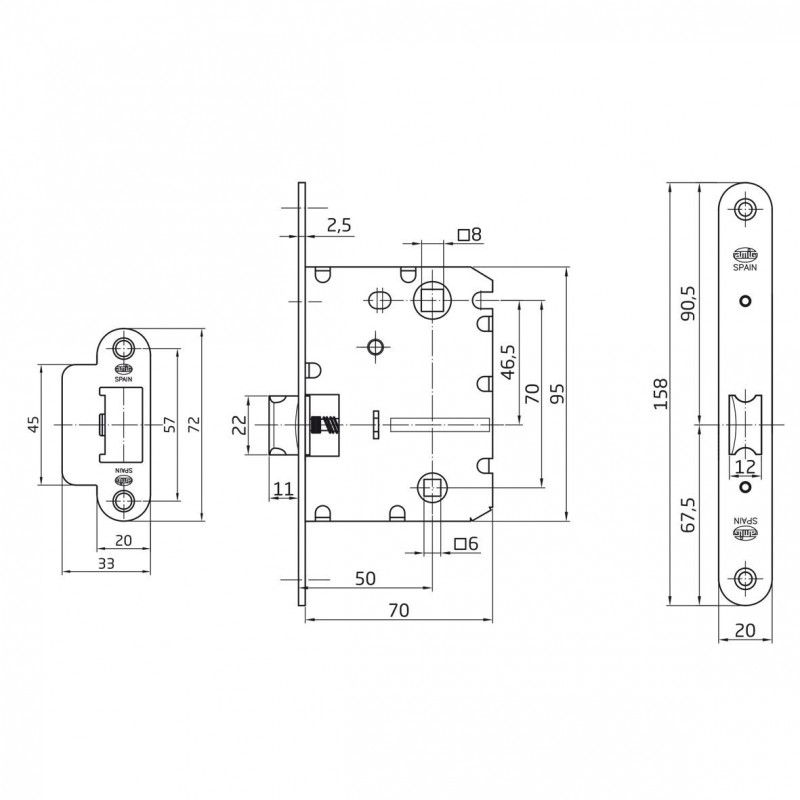 Picaporte pestillo unificado de entrada 50 mm con lengüeta reversible. Frente y soporte de acero en canto redondo. Para manillas de roseta con tornillos pasantes y cuadradillo de 8 mm y condenas de 6 mm. Distancia entre nuecas: 70 mm. Largo de frente: 158 mm. Ancho de frente: 20 mm. Giro manilla: 23º. Asimétrico. Máximo tornillo M5: Distancia 38-40 mm. Para puertas de madera de paso o de baño.
