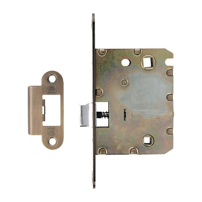 Picaporte pestillo unificado de entrada 50 mm con lengüeta reversible. Frente y soporte de acero en canto redondo. Para manillas de roseta con tornillos pasantes y cuadradillo de 8 mm y condenas de 6 mm. Distancia entre nuecas: 70 mm. Largo de frente: 158 mm. Ancho de frente: 20 mm. Giro manilla: 23º. Asimétrico. Máximo tornillo M5: Distancia 38-40 mm. Para puertas de madera de paso o de baño.