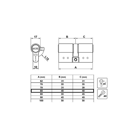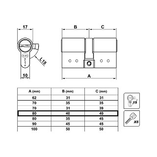 Cilindro de alta seguridad en latón con 6 pines y leva de 15 mm.Doble embrague.1 pin antitaladro en el cuerpo y 2 en el rotor.Barra antiextracción y antirrotura de acero inoxidable.Protegido contra ganzúa.Sistema antibumping.Muelles de acero inoxidable.Cilindro codificado con tarjeta de propiedad para la copia de llaves.Incluye 5 llaves.Uso en cerraduras para carpintería de madera junto con escudos tipo calavera de Ezcurra.