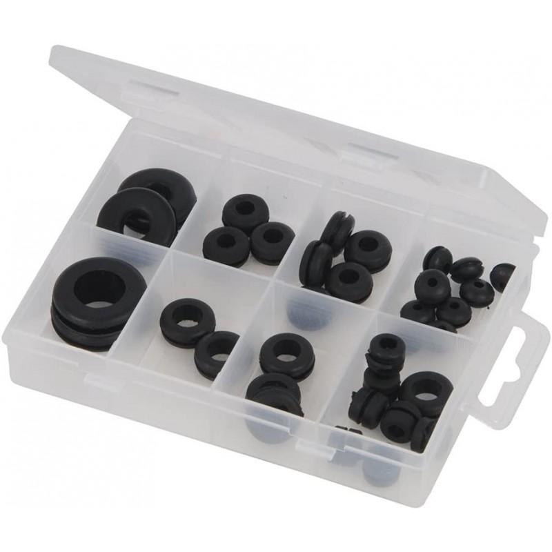 Arandelas de goma. Indicadas para minimizar las vibraciones y para uso industrial. Evita el roce al pasar cables y tubos en paneles metálicos. Tamaños: 2,5 x 10,5 x 6,5 hasta 16 x 29 x 7,5 mm.Estuche de almacenaje con diferentes compartimentos