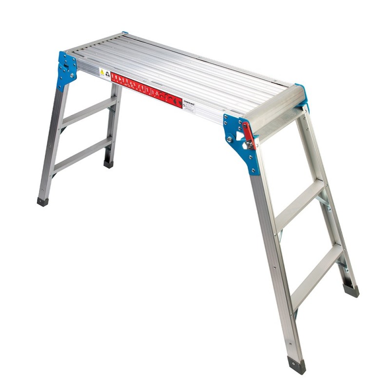 Plataforma con patas antideslizantes fabricada en aluminio anodizado y endurecido. Patas plegables con 2 cierres de seguridad. Dimensiones de la plataforma (L x An x A): 1.440 x 445 x 800 mm. Dimensiones plegada (L x An x A): 900 x 470 x 165 mm. Peso: 5,5 kg. Capacidad de carga: 150 kg. Conforme a EN14183.
