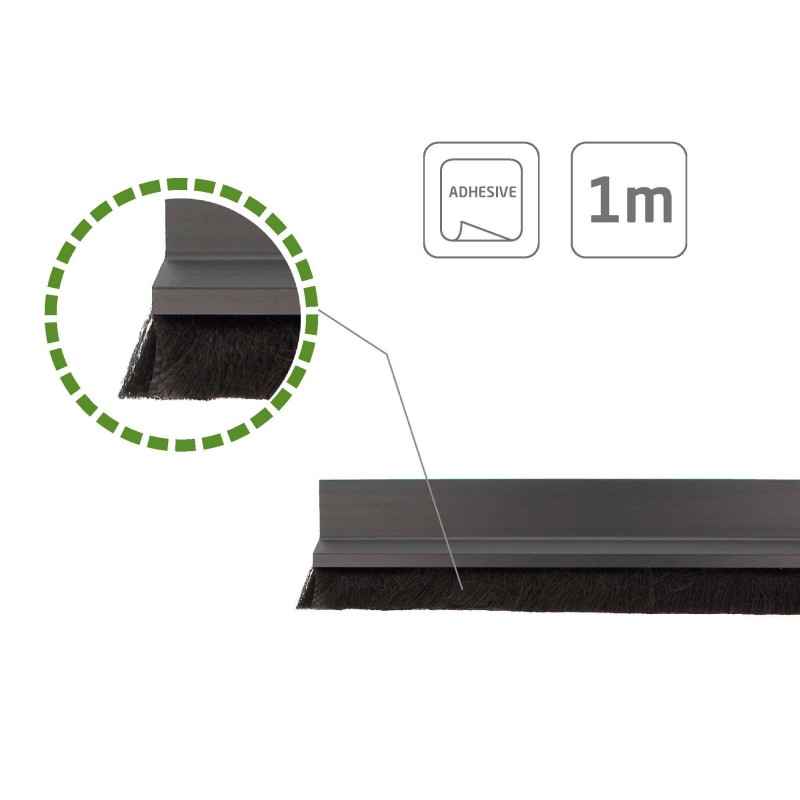 Burlete de PVC Negro de sobreponer para puertas de 100cm. Adhesivo de alta calidad. Cepillo de pelo 18 mm.