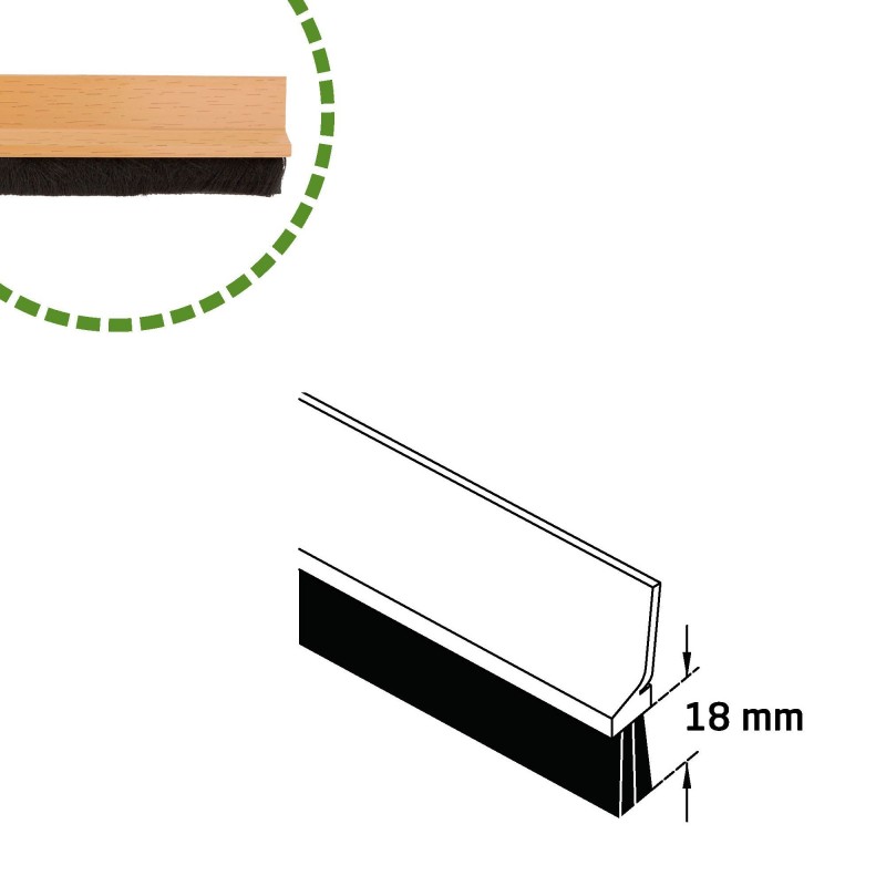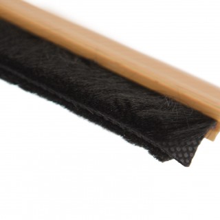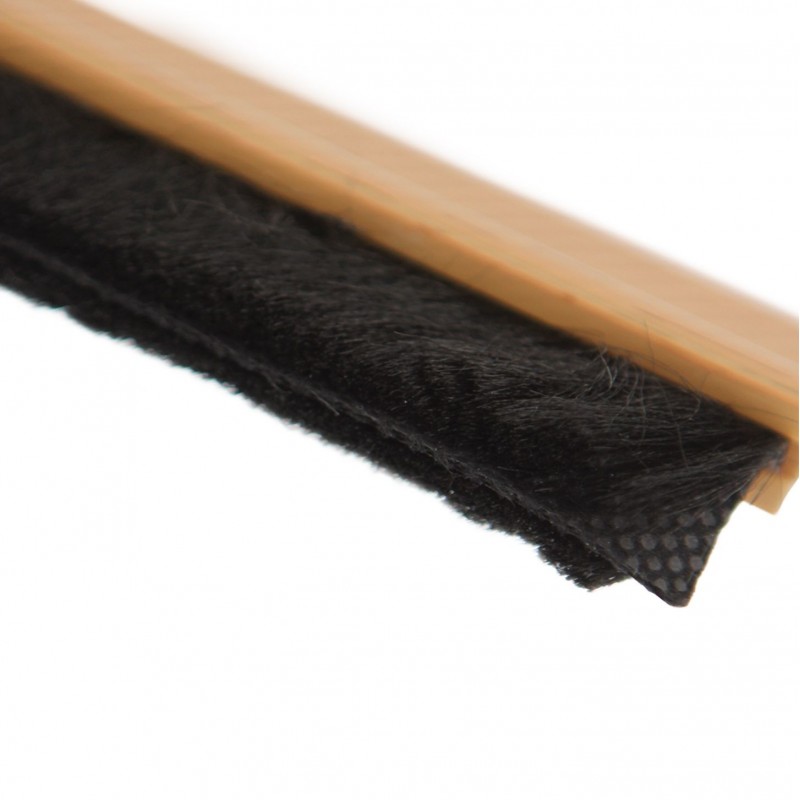 Burlete de PVC de sobreponer para puertas pvc Roble. Adhesivo de alta calidad. Cepillo de pelo 18 mm. Lámina de plástico entre la escobilla.