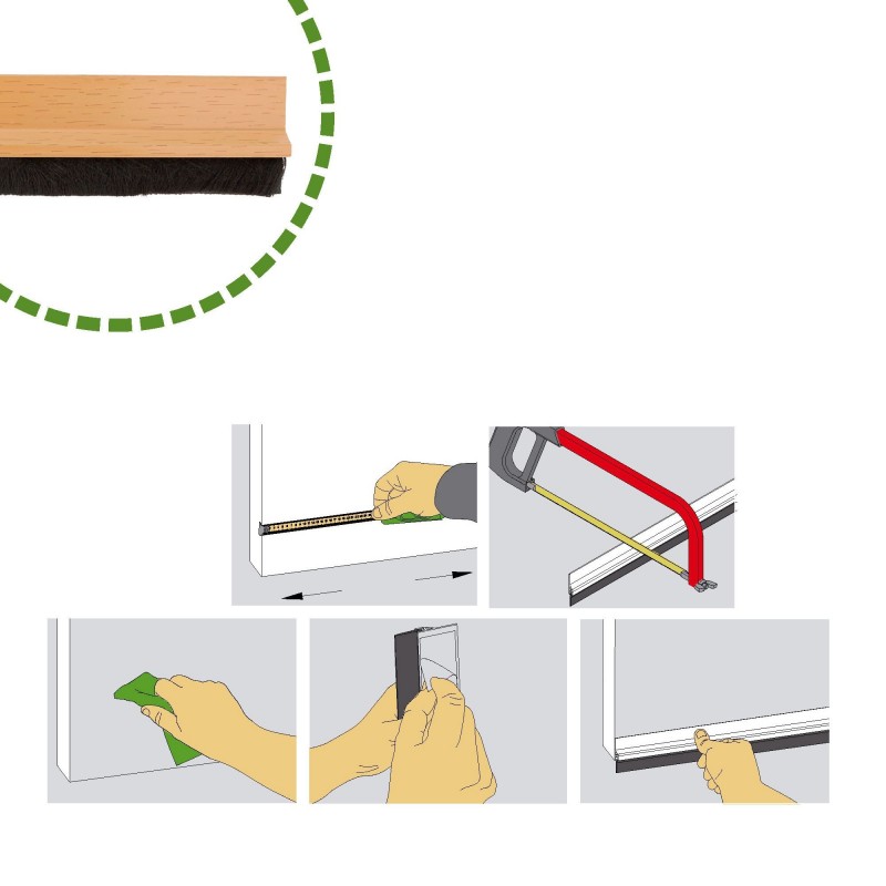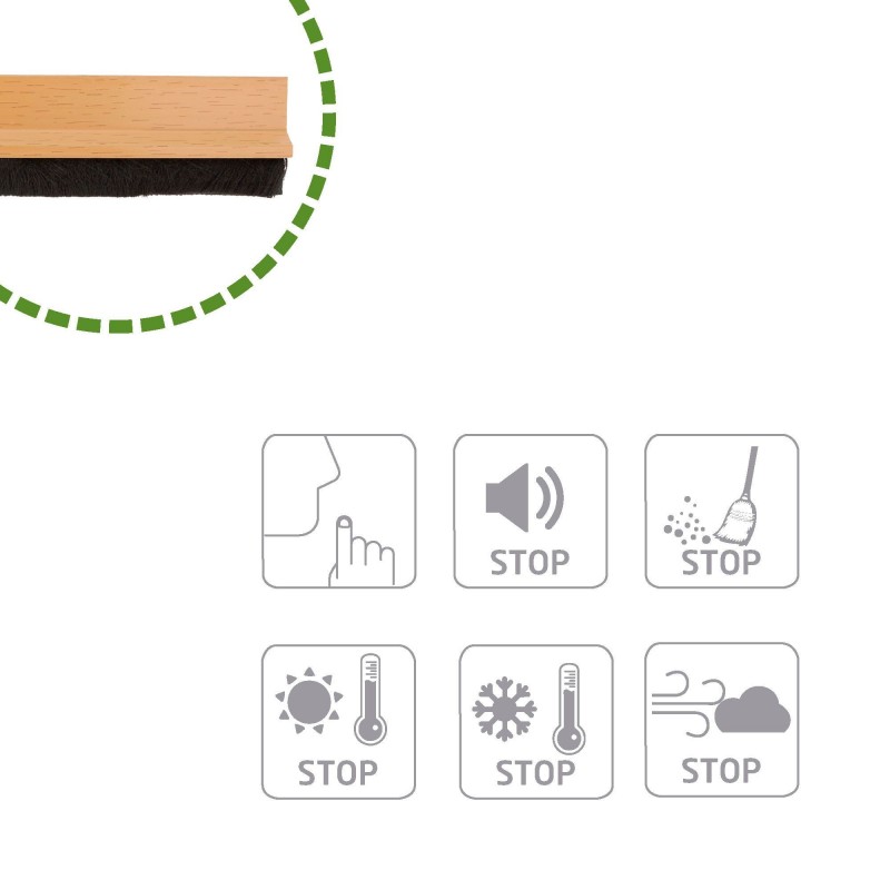 MÚLTIPLES SOLUCIONES: Ahorra energía evitando corrientes de aire frío en invierno y calor en verano. Previene la entrada de insectos y polvo por el hueco del bajo de la puerta, así como la entrada de agua en puertas que den al exterior. DISEÑO: Su cepillo de pelo evita daños y roces en el suelo. Además, cuenta con una lámina de plástico en el interior de la escobilla para una protección extra. CALIDAD Y DURABILIDAD: Fabricado en PVC y con un potente adhesivo que lo hace muy resistente y evita deformaciones con el paso del tiempo. FÁCIL DE INSTALAR: Gracias a su tira adhesiva de alta fijación, podrás instalarlo en tan solo 2 minutos de forma sencilla y sin necesidad de hacer agujeros en las puertas.