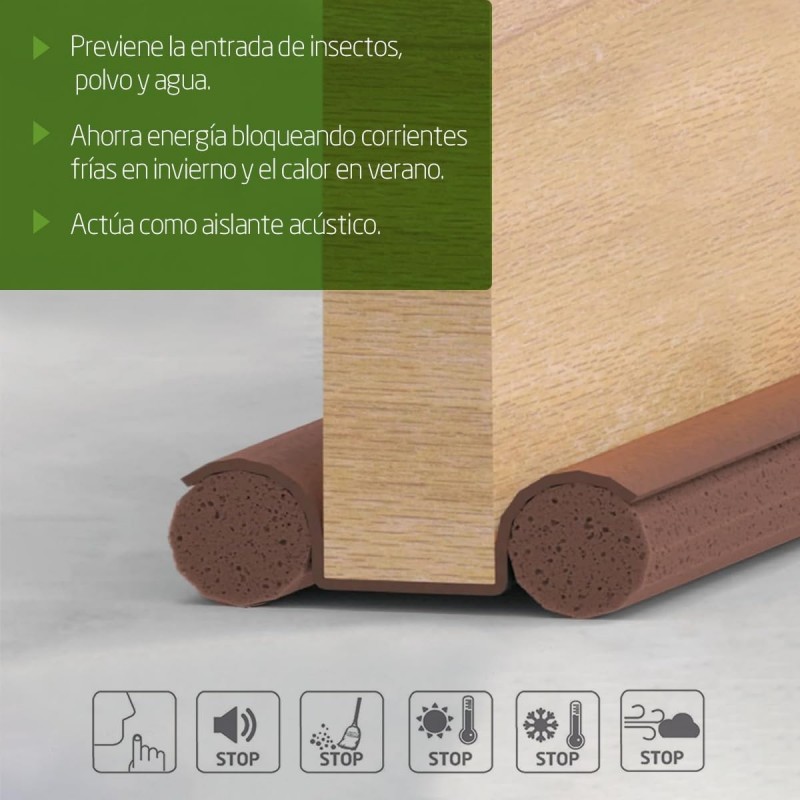 - MÚLTIPLES SOLUCIONES: Burlete para puertas que ahorra energía evitando corrientes de aire frío en invierno y calor en verano. Previene la entrada de viento, insectos y polvo por el hueco del bajo de la puerta. Actúa también como aislante acústico.