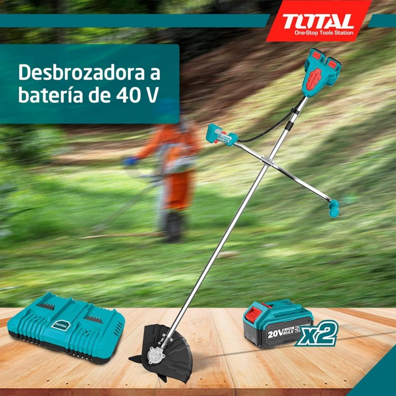 Desbrozadora a batería de 40 V. Motor brushless. Velocidad en vacío de 6500 rpm. Diámetro de corte 255 mm. Incluye cabezal de hilo y disco 3 puntas. Necesarias dos baterías para su funcionamiento. Incluye 2 bateríasde 4 Ah y cargador rápido doble.